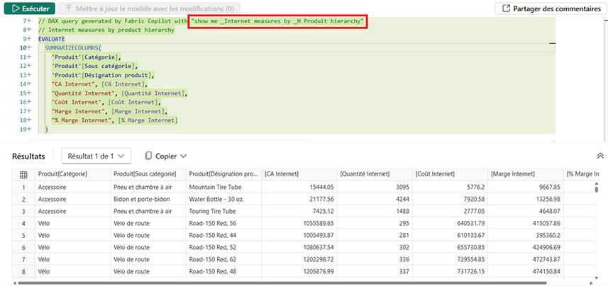 Exemple : Il est possible de référencer des mesures regroupées dans un dossier spécifique et les afficher via une hiérarchie. Copilot générera alors une requête DAX correspondant à cette structure à partir d’une simple demande de l’utilisateur.
