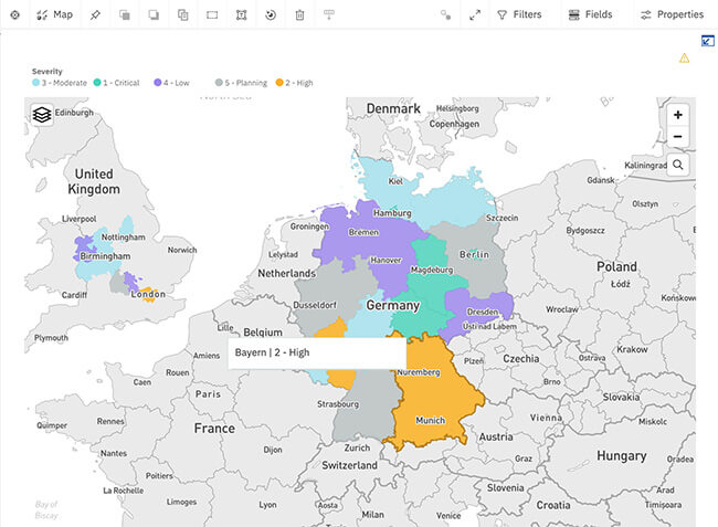 La cartographie s'est enrichie de la possibilité de colorer des zones géographiques par catégorie et non plus seulement par rapport à un indicateur.